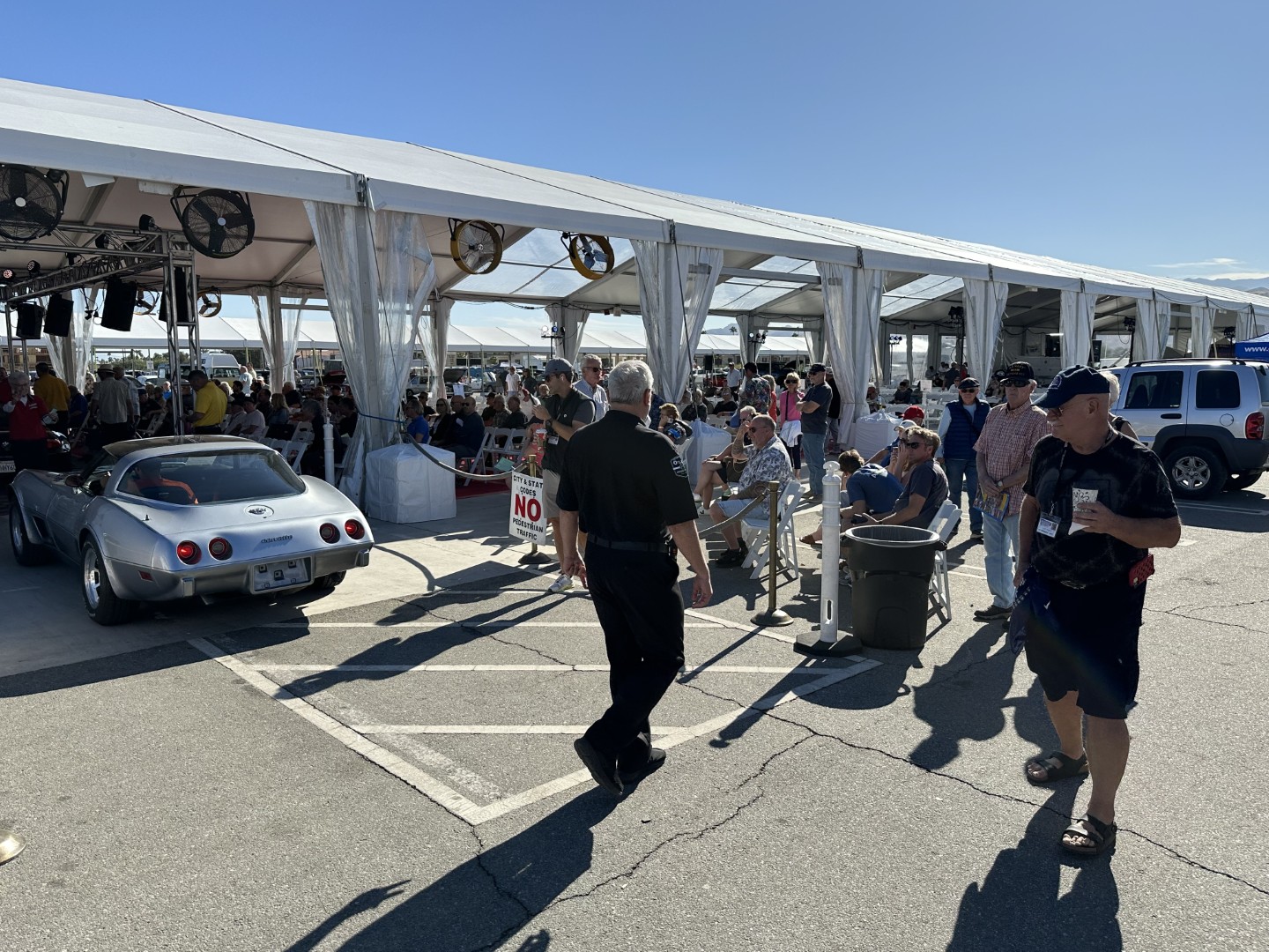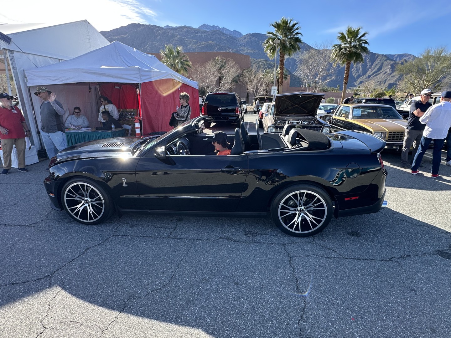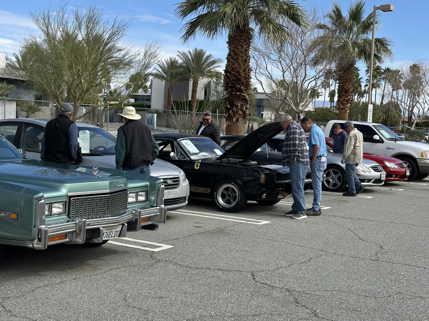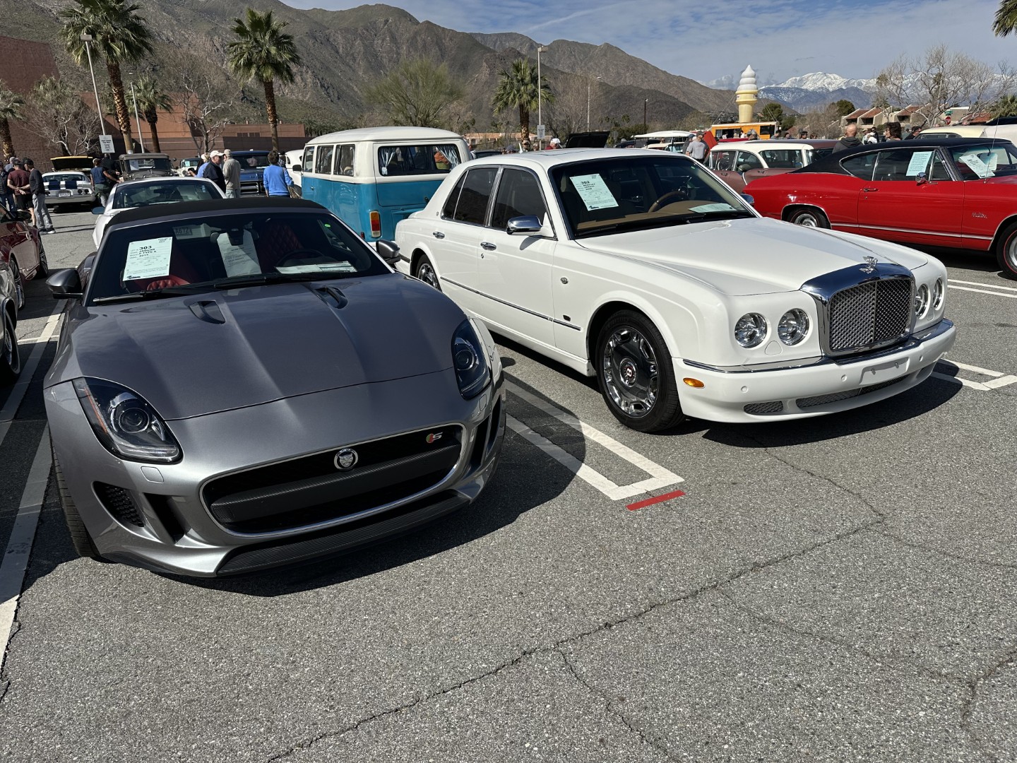 backdrop of the San Jacinto Mountains, rows of polished chrome, bright
